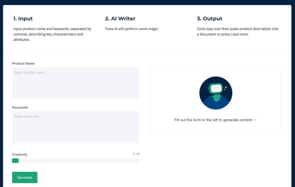 Frase.io is your go-to companion for store description perfection. This ingenious tool combines the power of AI and natural language processing to create informative and SEO-friendly product descriptions.