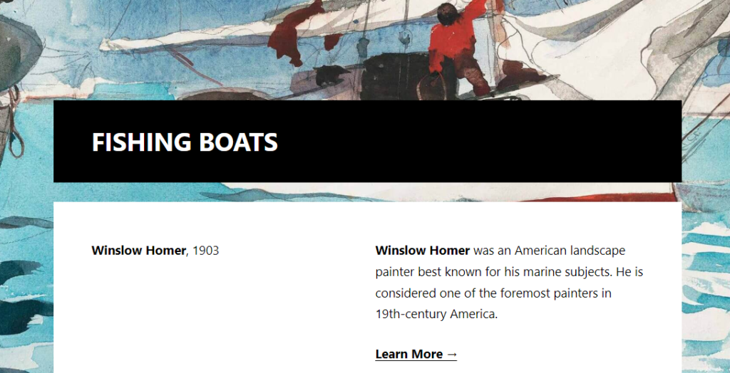 <!-- /wp:columns --> <!-- wp:cover {"url":"https://s.w.org/patterns/files/2021/08/Fishing-Boats-Key-West-Winslow-Homer-scaled-1.jpg","id":2170,"dimRatio":0,"focalPoint":{"x":0.5,"y":"1.00"},"minHeight":63,"minHeightUnit":"vw","contentPosition":"bottom center","isDark":false,"align":"full","style":{"spacing":{"padding":{"top":"600px","right":"0px","bottom":"0px","left":"0px"}}}} -->