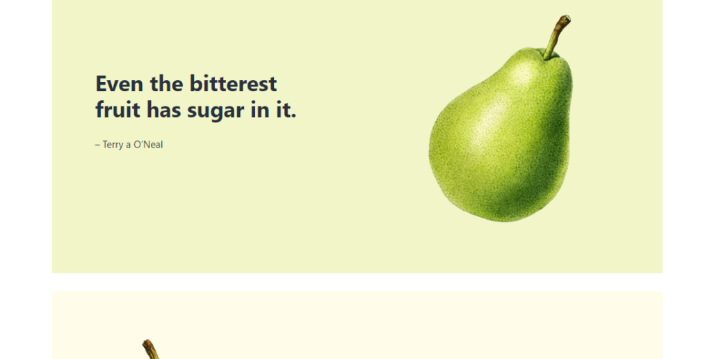 <div class="wp-block-media-text alignwide is-stacked-on-mobile is-vertically-aligned-center has-background" style="background-color:#fffdea"><figure class="wp-block-media-text__media"><img src="https://s.w.org/patterns/files/2021/06/pear-half-1024x1024.png" alt="" class="wp-image-673 size-full" /></figure><div class="wp-block-media-text__content"><!-- wp:group {"style":{"spacing":{"padding":{"top":"2em","right":"2em","bottom":"2em","left":"2em"}}}} -->