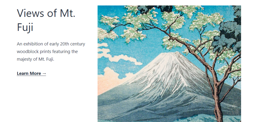 <!-- /wp:cover --> <!-- wp:cover {"url":"https://s.w.org/patterns/files/2021/06/Mount-Fuji-From-Hakone-Hiroaki-Takahashi-scaled.jpg","id":665,"hasParallax":true,"dimRatio":40,"overlayColor":"primary","contentPosition":"center center","isDark":false,"align":"full","style":{"spacing":{"padding":{"top":"5vw","right":"5vw","bottom":"5vw","left":"5vw"}}}} -->