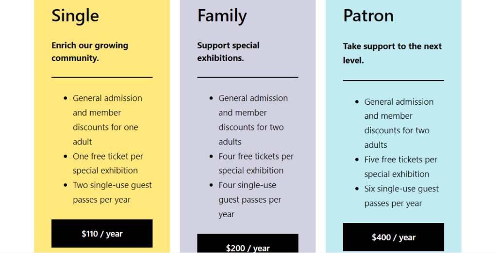 <ul class="has-normal-font-size"><li>General admission and member discounts for one adult</li><li>One free ticket per special exhibition</li><li>Two single-use guest passes per year</li></ul>