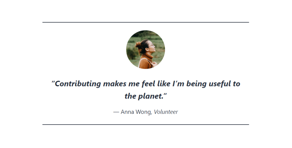 <blockquote class="wp-block-quote has-text-align-center is-style-large"><p>"Contributing makes me feel like I'm being useful to the planet."</p><cite>— Anna Wong, <em>Volunteer</em></cite></blockquote>
