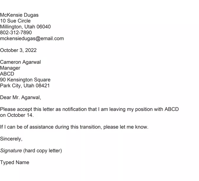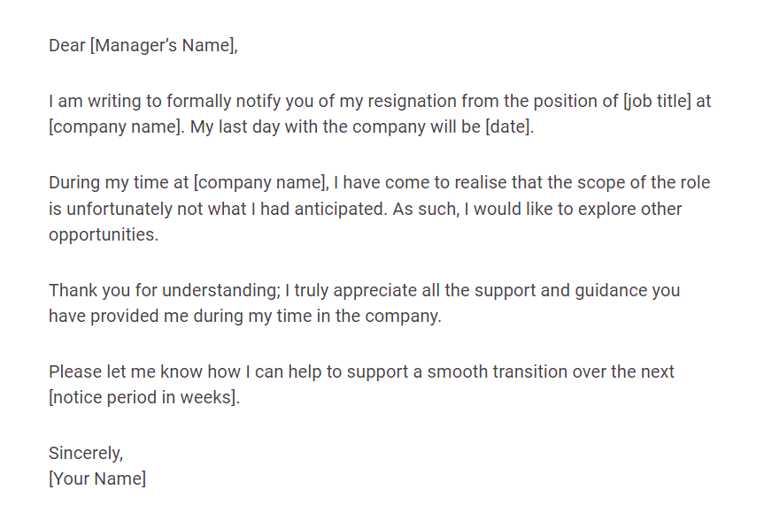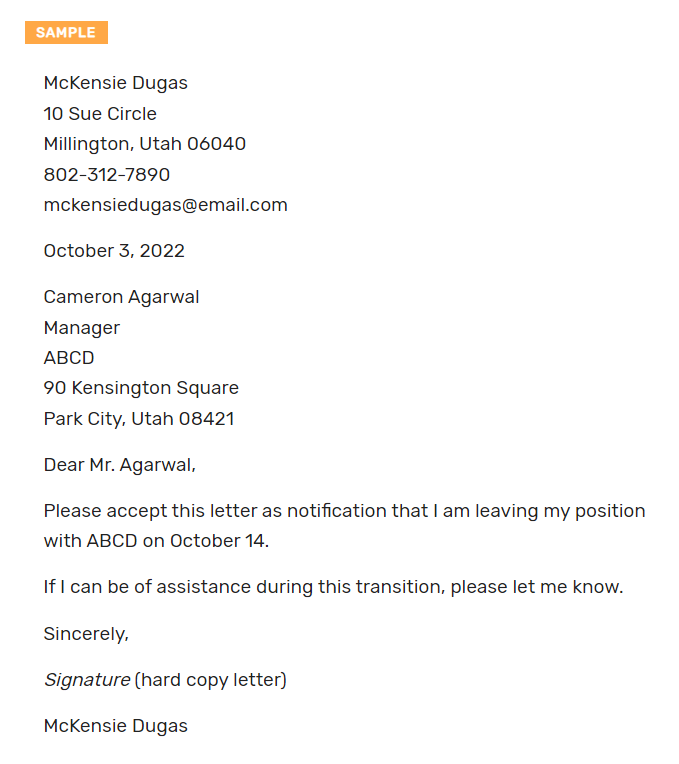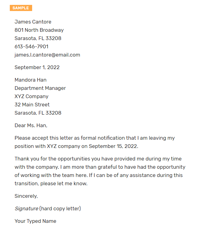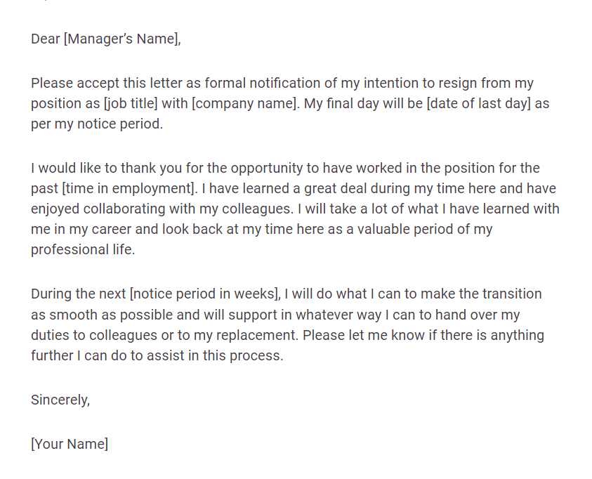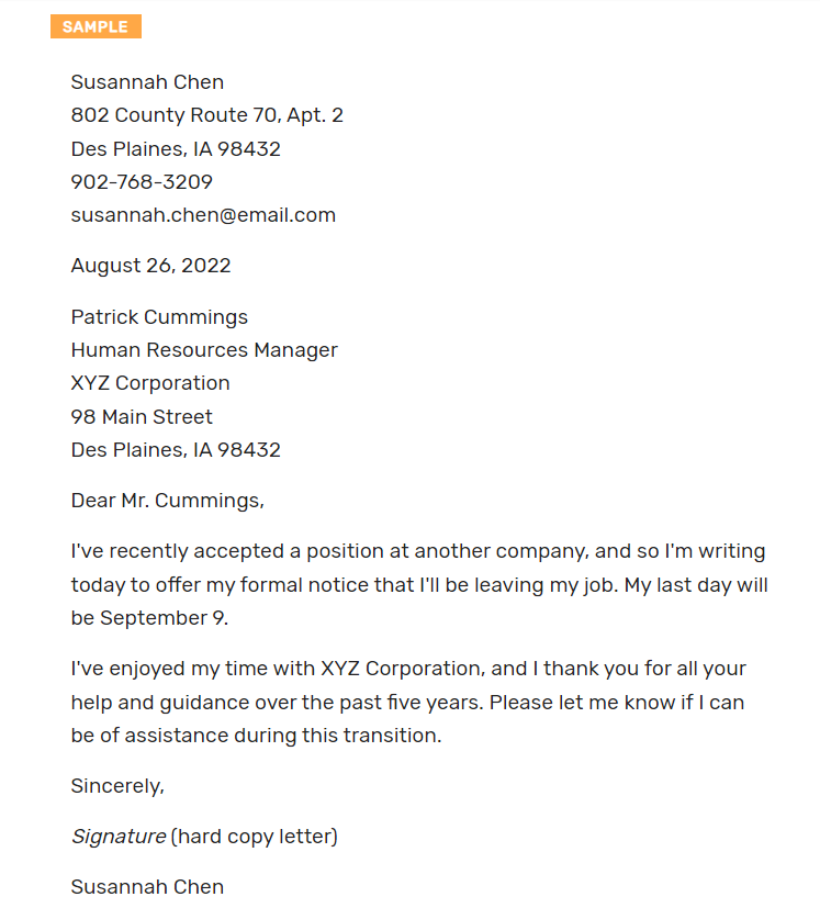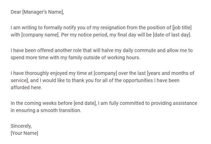 You can’t say you’re the best person for the job because you’ve already been offered the best position. Your resignation letter should be short and to the point.
