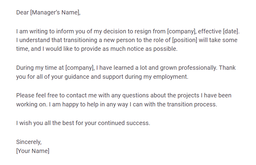 You should also use your resignation letter to let your manager and company leaders know why you’re quitting and what your plans are for the future. This is an excellent opportunity to give yourself a pat on the back and look forward to the new job.