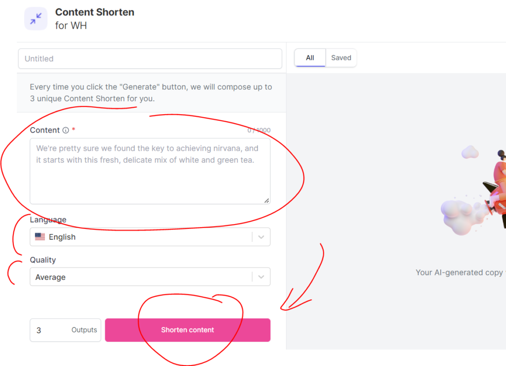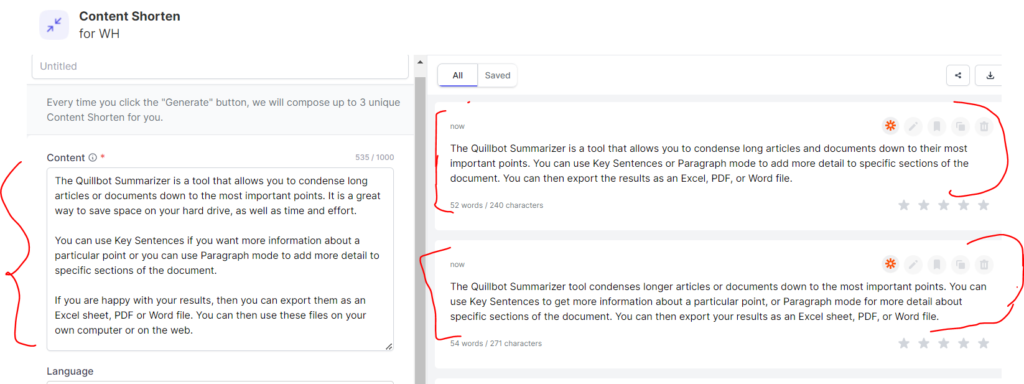 You may use the content shorten tool to paste your text of up to 1k characters, pick the language, the quality, and hit the shorten content button. This function is ideal for brief paragraphs.