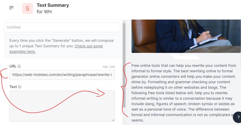 Let’s say we want to summarize this “Rewrite informal to formal generators” article, so we obtained the article URL, pasted it into the Text Summarizer, then clicked the “Generate Summary” button, and voila, the tool just imported us the summary without us having to copy and paste the text. It automatically analyzes what’s within the link, reads the material, and summarizes it in seconds.