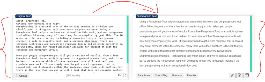The results are like the screenshot above in this feature, generally, the tool can get the important ideas from the whole text,and pout them together in away that makes a good paragraph.